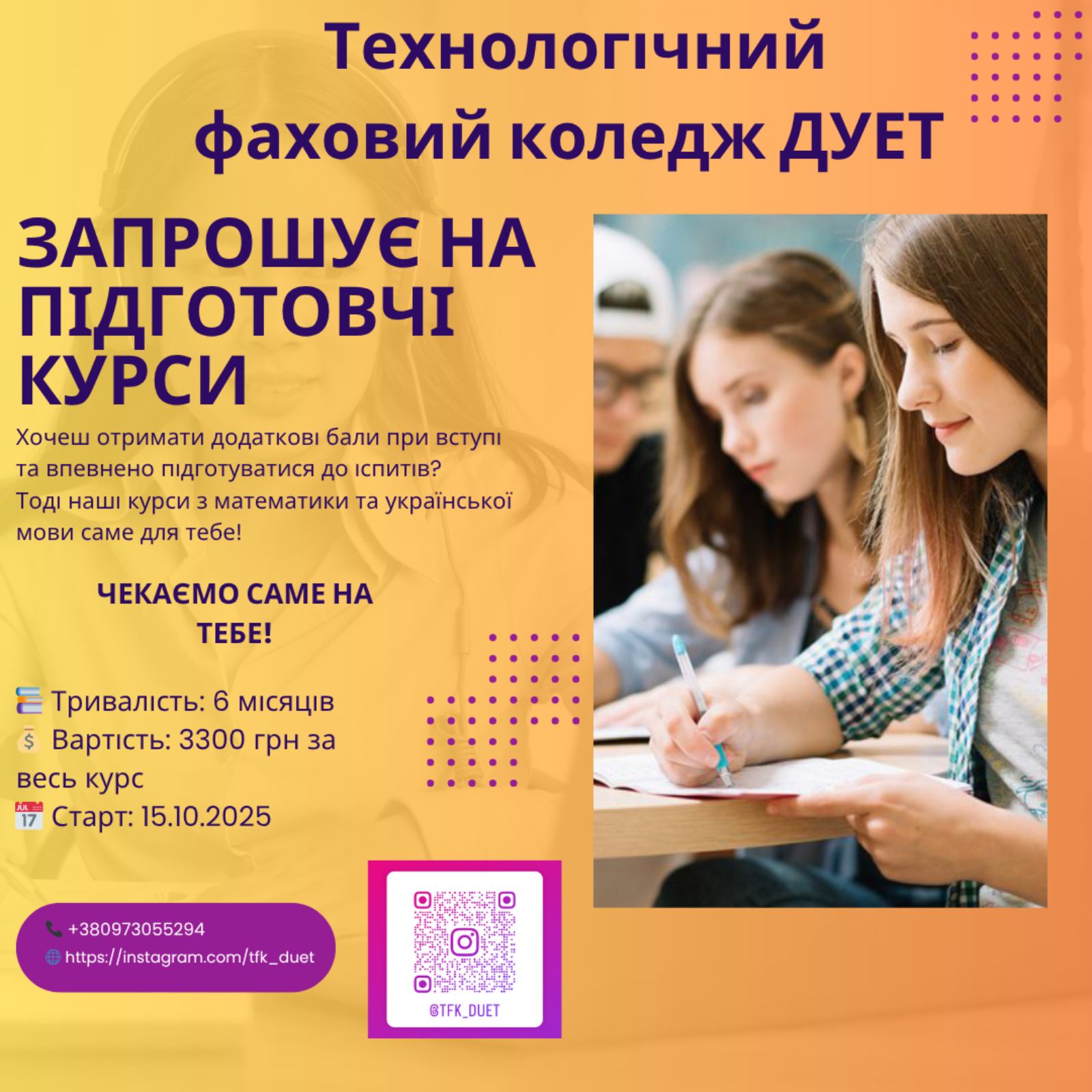 ВСП «Технологічний фаховий коледж Державного університету економіки і технологій» оголошує набір на підготовчі курси для успішного вступу.